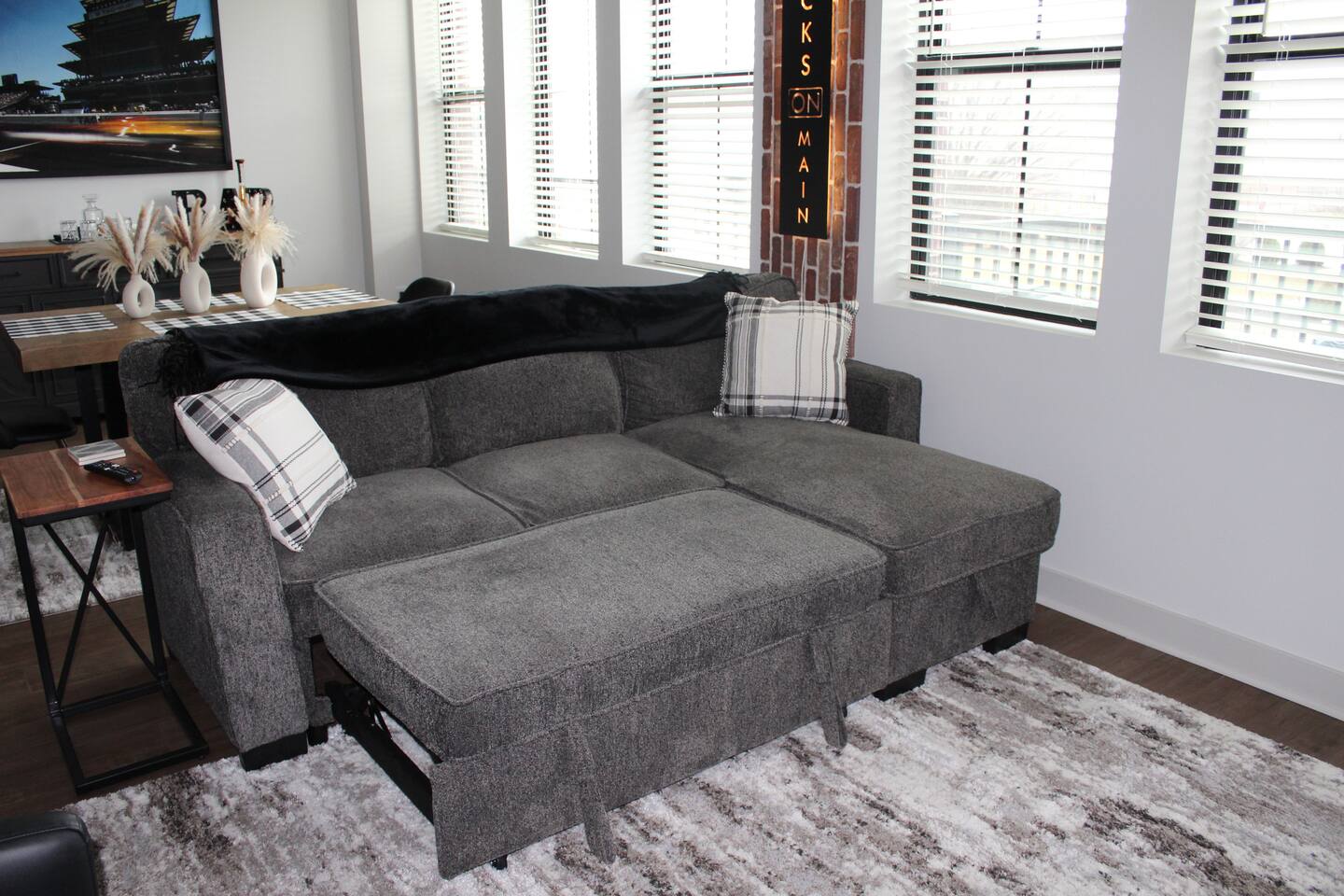 Bricks on Main | Modern Comfort in Speedway Welcome to Bricks on Main, a stylish 1-bedroom, 1-bathroom condo in the heart of Speedway, Indiana. Just steps from the Indianapolis Motor Speedway and minutes from downtown Indianapolis, this modern retreat is your perfect home base for exploring everything the area has to offer. Why You’ll Love It: **Prime Location: Located on Main Street, Bricks on Main offers unparalleled convenience. Walk to the iconic Indianapolis Motor Speedway, or take a short drive to downtown Indy and Lucas Oil Raceway. You’ll also have quick access to major highways, making it easy to explore the wider area. **Local Delights: Immerse yourself in Speedway’s vibrant local scene with a 2-minute walk to a variety of restaurants, unique shops, and breweries. Enjoy dining at O’Reilly’s, Tacos and Tequila, or Dawson’s on Main. Start your day with breakfast at Le Peep or grab a coffee at The Bev Shop, both conveniently located on the first floor of the building. **Outdoor Adventure: The nearby B&O Trail, just a block away, offers 2.5 miles of scenic, paved paths—perfect for a morning run or an evening stroll. Modern Amenities: **Comfortable Living: The condo comfortably accommodates up to 4 guests, featuring a spacious bedroom, a fully equipped kitchen, and an open-concept living area that’s perfect for relaxing or entertaining. The private outdoor patio provides a tranquil space to unwind after a day of adventure. **Entertainment Options: Enjoy the latest shows and movies on the 65” 4K smart TV in the living room and the 42” smart TV in the bedroom, both equipped with Netflix, Hulu, and full digital cable. **Fully Equipped Kitchen: Whether you’re whipping up a quick breakfast or preparing a full meal, the kitchen is stocked with all the essentials, including a brand-new refrigerator, stove, microwave, and coffee maker. **Convenient Parking: Take advantage of free parking in the building’s lot or on the street, making your stay even more hassle-free. Getting Around: **Easy Access: Downtown Indianapolis is just a 15-minute drive or Uber/Lyft ride away, where you can visit Lucas Oil Stadium, Gainbridge Fieldhouse, the Indianapolis Zoo, and the Convention Center. The condo is also a quick 5-minute drive to the nearest highway, making it easy to get wherever you need to go. At Bricks on Main, we’re dedicated to making your stay as comfortable and enjoyable as possible. If you need anything during your visit, don’t hesitate to reach out—we’re here to help!